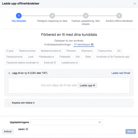 Du kan välja mellan olika datatyper exempelvis mejladress, förnamn, efternamn etc som sedan matchas mot personernas Facebook-konton. Det finns en filmall att ladda ner och använda för att göra det hela lite enklare. Facebook rekommenderar att man använder flera datatyper för att öka chansen att de ska kunna hitta en match. När man laddat upp filen mappar du den mot Facebooks datatyper, sen är offline-händelseuppsättningen klar. Något man ska komma ihåg är att om kunderna till exempel inte använder samma mejladress när de handlar som de har på sitt Facebook-konto så kommer Facebook inte att kunna matcha datan.