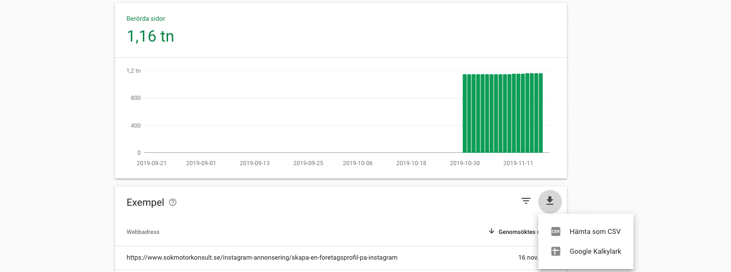 - Skapa en .csv fil av alla indexerade hackade URL:er