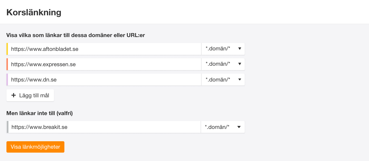 Det är ganska straight-forward egentligen, i de ovanstående raderna lägger du in dina största konkurrenters domäner, och under ”Men länkar inte till” lägger du in din domän. När du klickar ”Visa länkmöjligheter” så får du upp samtliga domäner som länkar till dina konkurrenter, men inte länkar till dig.