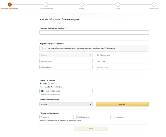 Verifieringen av kontaktperson och bolaget. Det här är ett av de steg som många fastnar i så var extra noggrann med att säkerställ att informationen du laddar upp är korrekt. Pass är att föredra framför nationellt ID-kort för identifiering av kontaktperson eftersom Amazon kräver att identifikationsinformationen ska finnas på engelska, vilket det gör i ett pass. Gällande verifiering av bank eller kreditkortsgivare är rekommendationen att kontakta de direkt och begära ut ett Bank account statement för Amazon så får du det på engelska i rätt format.
