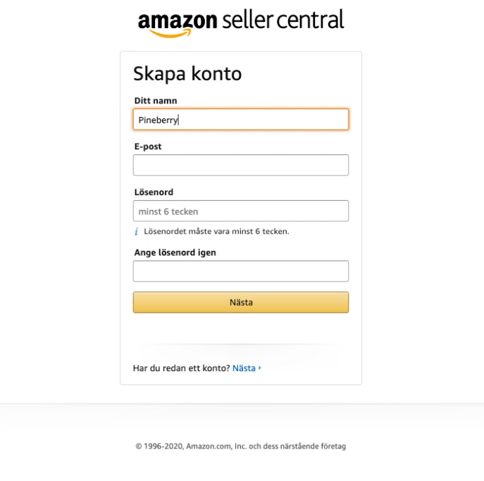 Skapa ett Amazon-konto på http://sellercentral.amazon.se/ genom att fylla i Namn, Email och lösenord.