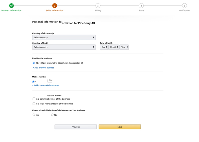 Fyll i personlig information för dig som kontaktperson eller ägare av bolaget som ska vara den verifierade kontakten för Amazon.