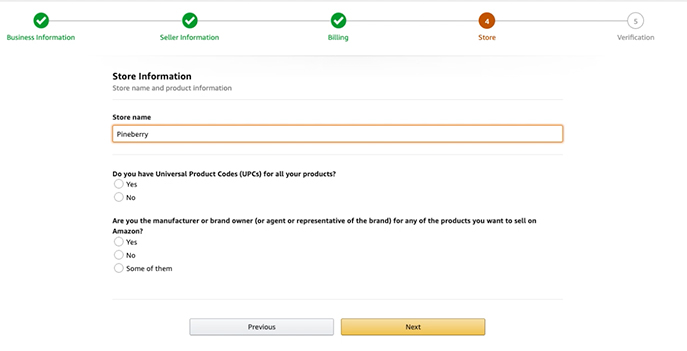 Detta steg handlar om att skapa butikens namn på Amazon samt dela med dig av information kring produkter och varumärket.
