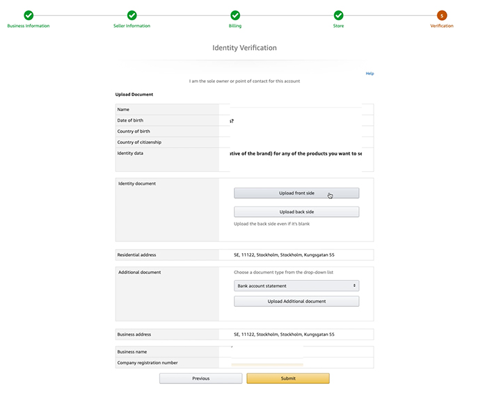 Verifieringen av kontaktperson och bolaget. Det här är ett av de steg som många fastnar i så var extra noggrann med att säkerställ att informationen du laddar upp är korrekt. Pass är att föredra framför nationellt ID-kort för identifiering av kontaktperson eftersom Amazon kräver att identifikationsinformationen ska finnas på engelska, vilket det gör i ett pass. Gällande verifiering av bank eller kreditkortsgivare är rekommendationen att kontakta de direkt och begära ut ett Bank account statement för Amazon så får du det på engelska i rätt format.